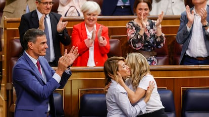 El primer paso en la aprobación parlamentaria de la primera ley de vivienda de la democracia retrató un marcador a favor de regular y limitar la subida de los precios de los alquileres, por parte de la mayoría progresista de esta legislatura y con la oposición de la derecha y la división del nacionalismo. También ha dejado este jueves otra imagen simbólica dentro de la coalición en el Gobierno: la bancada del PSOE sí se levantó esta vez tras el debate para aplaudir elocuentemente a la ministra de Fomento, Raquel Sánchez, de su partido; la de Unidas Podemos, sentada, aplaudió el éxito de la norma y a su representante en el Ejecutivo, Ione Belarra. Nada que ver con el escenario observado la semana pasada en el mismo hemiciclo para corregir la llamada ley del solo sí es sí. La ley prosperó en cualquier caso con el apoyo de 176 votos: los del PSOE, Unidas Podemos, ERC y EH Bildu. La derecha y varios partidos nacionalistas —vascos y catalanes— la rechazaron porque argumentan que no arregla el problema de la vivienda e invade competencias autonómicas.