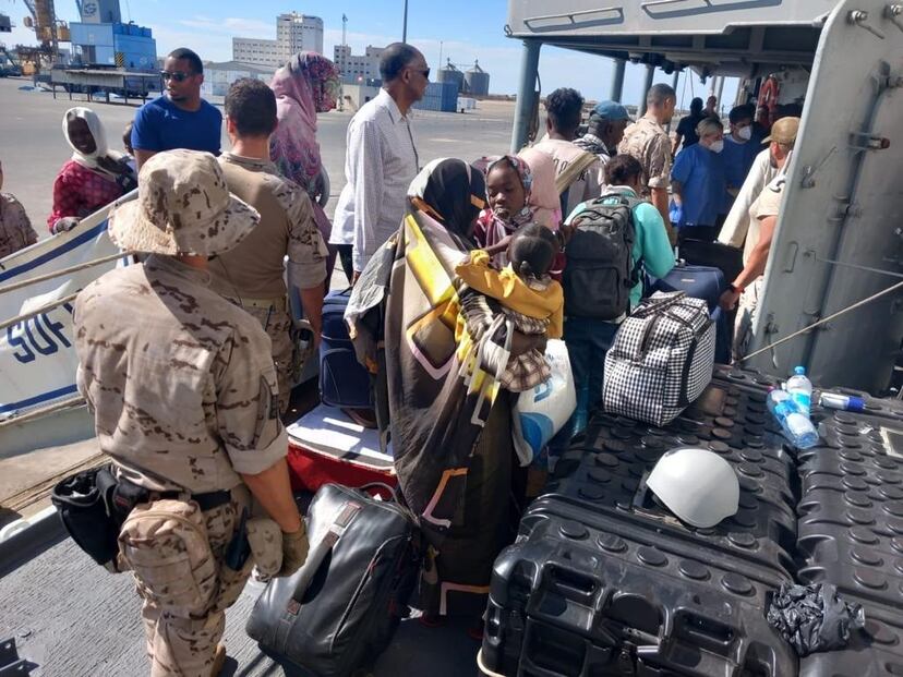 Arabia Saudí ya evacuó a sus nacionales y a los de otros estados árabes a través de Puerto Sudán, pero los países europeos (España, Francia, Italia o Alemania) prefirieron hacerlo entonces por vía aérea desde una base militar próxima a Jartum, ante el riesgo que suponía recorrer los 800 kilómetros que separan la capital sudanesa del principal puerto del país. La fragata Reina Sofía, con 204 tripulantes, embarca un equipo de operaciones especiales y un helicóptero AB-212.