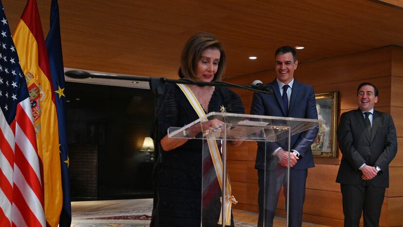 Sánchez llegó un día antes a Washington para poder estar en un acto especialmente simbólico de ese vínculo con los demócratas que busca el líder del PSOE y presidente de la Internacional Socialista. El presidente viajó justo después de un Consejo de Ministros extraordinario sobre la sequía y llegó a la capital de Estados Unidos en la noche del jueves, hora española, para entregar a Nancy Pelosi, histórica líder demócrata y expresidenta de la Cámara de Representantes, la Gran Cruz de la Orden de Isabel la Católica, que fue concedida por el Gobierno español. En un acto cerrado a la prensa en la Embajada española, Sánchez destacó que Pelosi “ha derribado muchos techos de cristal y superado muchos límites con determinación y firmeza” al ser la primera mujer en presidir la Cámara de Representantes. El presidente español destacó además el trabajo de Pelosi para reforzar las relaciones entre Estados Unidos y España y defendió que este vínculo transatlántico está ahora más fuerte que nunca.