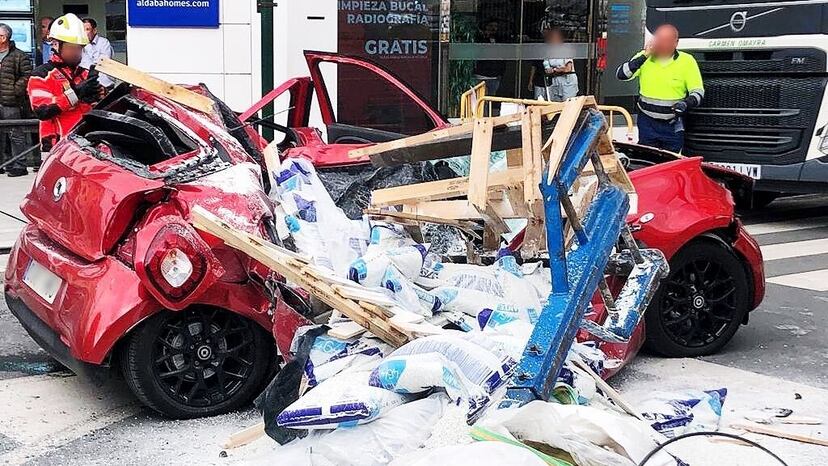 Una mujer que circulaba este martes por la tarde por la calle Arabial de Granada salió prácticamente ilesa tras caer encima de su coche un palé de sacos de material de construcción. Las imágenes del siniestro, ocurrido a las 17.25, muestran un coche Smart de color rojo con el techo destrozado y cubierto de polvo, fragmentos de palés y sacos de un material aislante que utiliza para impermeabilizar las terrazas. Cuando los testigos se acercaron al coche, encontraron a la mujer viva y sin daños aparentes. Cortaron el cinturón de seguridad y liberaron a la mujer que, según la información oficial, no sufrió ninguna herida o contusión de gravedad.