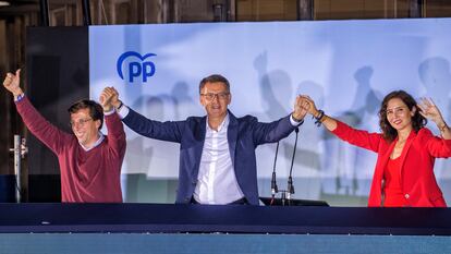 Solo los profesionales de la actuación, los actores, saben disimular la decepción cuando pierden —y en los Oscar ni siquiera les sale siempre—. Este domingo, las caras en el PP eran una fiesta y las del PSOE, un poema. Los populares desplegaron el atrezo de las grandes ocasiones —su balcón— y los lemas propios de la victoria — “¡hemos hecho historia!”;— y los socialistas comparecieron descompuestos tras el atril y con las frases típicas de la derrota —”no ha podido ser”—. El líder nacional del PP, Alberto Núñez Feijóo, se asomó al balcón de Génova al ritmo de Coldplay; el alcalde de Madrid, José Luis Martínez-Almeida, saludó a lo Bisbal —”¿cómo están los máquinas?”— y la presidenta de la Comunidad, Isabel Díaz Ayuso, lanzaba besos al público mientras en la sede de Ferraz, Pilar Alegría admitía, ante un silencio de funeral: “Es un mal resultado. Entendemos el mensaje. Tenemos que hacer las cosas mejor”.