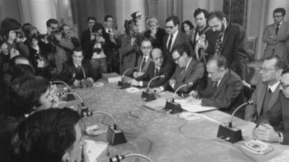 Los Pactos de La Moncloa de 1977 se han erigido en un ejemplo a seguir y al mismo tiempo, en una utopía imposible de cumplir para la política española en su situación actual. Las propuestas que Pedro Sánchez y Alberto Núñez Feijóo se han cruzado este miércoles en su tercera reunión desde abril de 2022 en su condición de líderes del PSOE y del PP, y por tanto, de los dos únicos partidos que, salvo la extinta UCD, se han alternado en la presidencia del Gobierno desde la restauración de la democracia, se antojan un ejercicio condenado a la melancolía.