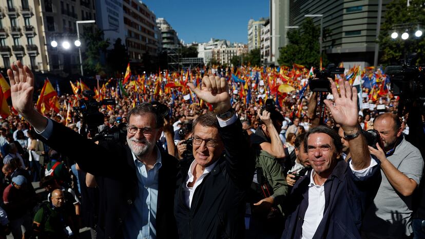 Feijóo tachó de “cacicada” e “indignidad” la eventual amnistía por los sucesos del procés, que todos en la plaza daban por sentada con pancartas, camisetas y mensajes que pedían “Puigdemont a la cárcel. Sánchez a la mierda”. Aseguró que el PSOE ya no es “un partido de Estado”, y, al igual que sus teloneros, invocó como mártires a la vieja guardia socialista (Felipe González, Alfonso Guerra y el recientemente expulsado Nicolás Redondo Terreros), que han dedicado los últimos días a hacer declaraciones muy parecidas a las de los dirigentes de la derecha: “Podrán ser expulsados, podrán ser señalados. Quizá no tengan sitio en su partido, pero seguirán teniendo sitio en la España de la convivencia que ayudaron a formar”.