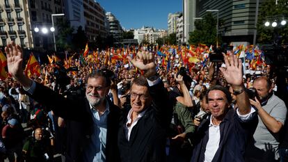 El presidente del PP, Alberto Núñez Feijóo, ha estado arropado en el acto contra la amnistía por los expresidentes del Gobierno José María Aznar y Mariano Rajoy, además de por la presidenta de la Comunidad de Madrid, Isabel Díaz Ayuso, y el alcalde de Madrid, José Luis Martínez-Almeida. El vídeo que acompaña a este mensaje recoge parte de las intervenciones que ha habido en el acto, que se ha celebrado en la capital del país solo dos días antes de que comience el debate de investidura del líder del PP. “Decir amnistía es decir que España es una dictadura opresora, que en Cataluña hay un conflicto y no una minoría independentista. Ya no tragamos más y por eso les decimos, de ninguna manera”, ha dicho Ayuso.