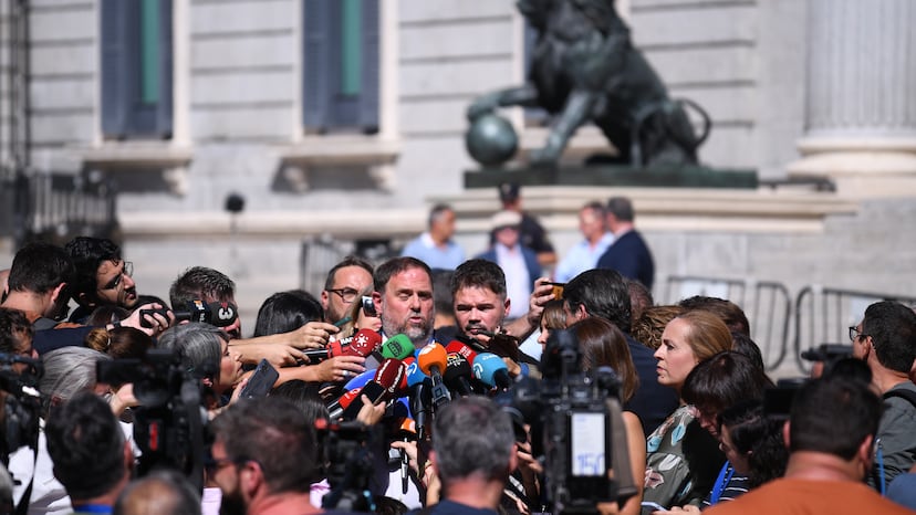 Delante de la Puerta de los Leones del Congreso, bajo el sol del mediodía, acorralado por un sinfín de periodistas y con el fondo sonoro de un espontáneo que no dejaba de increparle, Junqueras dio rienda suelta a su proverbial ambigüedad. Usó un tono conciliador, al tiempo que ponía de manifiesto que el PSOE no puede dar por hecho —”absolutamente no”— el apoyo de ERC a una eventual investidura de Sánchez. Sobre la negativa de los socialistas catalanes a suscribir el viernes una resolución en el Parlament a favor de la amnistía, el presidente de Esquerra deslizó lo que podía sonar como un aviso: “El PSC sabrá lo que hace y si esto le conviene o no para la investidura de Sánchez”.