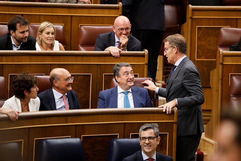 “Ha hecho hoy usted más amigos”, le dijo molesto el portavoz del PNV, Aitor Esteban, a Feijóo el miércoles, tras un agrio choque parlamentario entre ambos. El líder del PP rompió puentes con el partido vasco con una dura intervención en la que, a pesar de que mantuvo un tono respetuoso, le metió el dedo en el ojo. Feijóo cuestionó la decisión del PNV de estar dispuesto a apoyar la investidura de Pedro Sánchez aludiendo a sus votantes conservadores, que no le han votado para aprobar “la política económica de Podemos”, y le advirtió de que pueden quedar en consecuencia superados por Bildu en las urnas. El líder del PP se lanzó también a cortejar al electorado de derechas del partido nacionalista. “Hay un votante del PNV conservador al que provoca desazón ver al PNV votar con Bildu y que forme parte de la coalición”, cargó Feijóo en su réplica a Esteban. Después del duelo, de mucha tensión, el líder del PP se acercó al escaño del portavoz vasco para limar asperezas, pero el malestar ya había prendido.