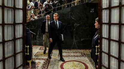 El líder del Partido Popular, Alberto Núñez Feijóo, abandona el hemiciclo tras la segunda votación de su investidura este viernes. / Juan Carlos Hidalgo / EFE