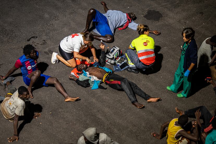 Al atracar el cayuco, los supervivientes, con los rostros desencajados, se pusieron nerviosos. En la proa, algunos jóvenes exclamaban “¡boza, boza!”, el grito habitual de los migrantes africanos cuando pisan territorio europeo. Fue un desembarco complejo porque la mayoría de sus ocupantes apenas podía sostenerse en pie. “En el momento en que entran en calor, se quedan dormidos”, explica una de las personas que ha intervenido en la recepción.