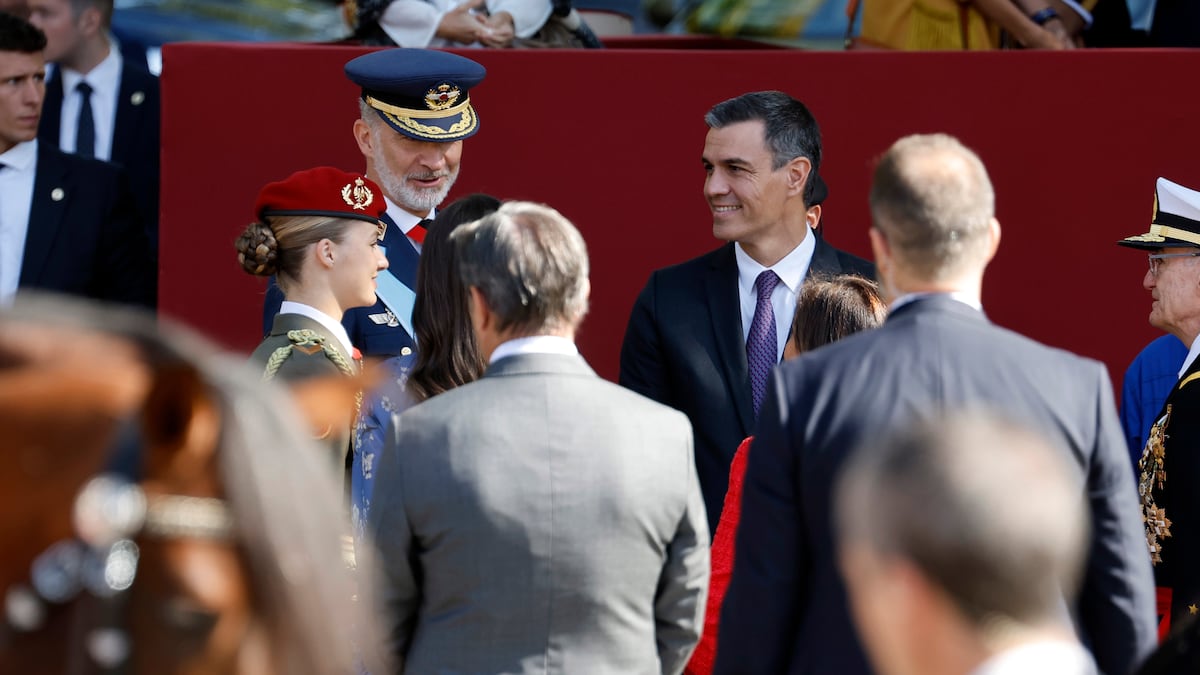 Ya al final del desfile, volvieron a arreciar los gritos de “¡Puigdemont a prisión!”, “¡Pedro Sánchez, sinvergüenza!”, o “¡Pedro Sánchez, dimisión!”. Fue cuando los Reyes y la heredera de la Corona subían a sus vehículos oficiales y enfilaban la ruta del Palacio Real, donde ofrecieron una recepción a sus más de 2.000 invitados con motivo de la Fiesta Nacional. Las protestas no se dirigían contra ellos, sino contra el presidente en funciones, cuyo coche giró por una calle lateral y evitó pasar por la zona donde se mezclaban las decenas de miles de personas que habían venido a contemplar la parada militar con los grupos que expresaban ruidosamente sus quejas. Los abucheos, pitidos e incluso insultos se han convertido ya en una tradición en el desfile de la Fiesta Nacional siempre que gobierna el PSOE. Se iniciaron en 2005, cuando estaba José Luis Rodríguez Zapatero en La Moncloa, y cesaron durante la presidencia del popular Mariano Rajoy, para volver cuando Pedro Sánchez llegó al poder, en 2018.