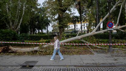Las muertes de los dos hombres en Andalucía son los incidentes más graves de la tormenta. El de Huelva se produjo a las 21.19 del domingo, cuando el vehículo cayó a la cuneta, donde quedó semivolcado, tras desprenderse una de las paredes del camino. El fallecido en Córdoba fue localizado la mañana de este lunes bajo unos cascotes provocados por los derrumbes del vendaval. En un primer momento, los investigadores han dejado todas las hipótesis abiertas sobre la causa de la muerte porque la Policía Local y los Bomberos actuaron en esa zona para retirar unas planchas de metal y no advirtieron su presencia. “En el momento en el que se actuó y se depositaron [las planchas de metal], allí no había ninguna persona fallecida ni cadáver”, ha explicado el alcalde José María Bellido (PP), que ha incidido en que había sido una “una circunstancia posterior”. Fuentes policiales citadas por Efe han concretado después que el hombre falleció por un golpe recibido por una placa metálica desprendida de un edificio cercano.