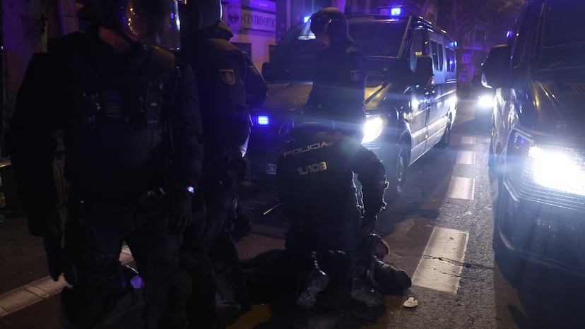 Pasadas las 22,30 y pocos segundos después de cantar el Cara el sol, desde la multitud se lanzó una bengala roja que caía a un par de metros de los furgones policiales, junto a la valla de protección en Ferraz. Después, dos botellas de vidrio. La línea de policía ha ganado varios metros y ha terminado cargando contra los concentrados y desalojando la calle. El balance final ha sido de 15 detenidos, todos ellos varones, según ha informado la Delegación del Gobierno. Pasadas las 23 horas, la calle Ferraz quedaba prácticamente despejada tras el primer choque con la Policía. Solo un grupo de jóvenes permanecía sentados en el suelo para frenar el paso de cuatro furgonetas de las fuerzas seguridad, sin que se volviera a producir altercados. “¿Dónde está la tele pa’ que grabe esto”, entonaban los últimos manifestantes.