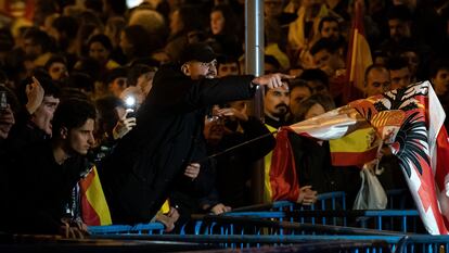 Entre los asistentes abundan los comentarios sobre las 15 detenciones que hubo en la noche del miércoles y sobre la arremetida de la Unidad de Intervención Policial (UIP) para despejar la zona. También se comenta entre grupos de amigos el saludo de Alberto Núñez Feijóo al recién elegido presidente del Gobierno tras la votación en el Congreso de los Diputados: “¿Pero cómo le va a dar la mano?”, afirma, airado, un hombre junto a la valla que separa a los manifestantes de la Policía.