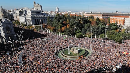 El rechazo a la amnistía ha concentrado a mediodía de este sábado en Madrid a 170.000 personas, según datos de la Delegación de Gobierno, en la primera gran manifestación contra la medida de gracia a los encausados por el procés celebrada tras la investidura de Pedro Sánchez. La multitudinaria protesta ha llenado la plaza de Cibeles y las calles aledañas, en una convocatoria impulsada por un centenar de asociaciones y foros cívicos próximos a la derecha y la ultraderecha. La iniciativa se presentaba como una defensa de la Constitución y el futuro de España que, según los promotores, se juegan el “ser o no ser” por culpa del pacto sellado por el PSOE con las fuerzas independentistas. Los organizadores han intervenido entre gritos de “¡Sánchez, a prisión!” y “¡Sánchez delincuente!” de los asistentes.