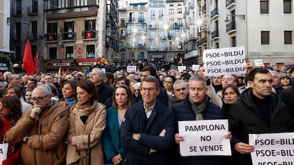 Alrededor de 10.000 personas, según la Delegación del Gobierno, se han concentrado este domingo en la plaza del Ayuntamiento de Pamplona para protestar por la moción de censura acordada entre PSOE y EH Bildu contra la alcaldesa Cristina Ibarrola, de UPN. En el acto, convocado por la formación regionalista con el lema “Pamplona no se vende”, han estado los principales dirigentes y líderes históricos del partido, como Yolanda Barcina o Miguel Sanz, expresidentes de la comunidad, así como Enrique Maya, predecesor de Ibarrola en el cargo. Además, la cita ha contado con la presencia del presidente del PP, Alberto Núñez Feijóo; su secretaria general, Cuca Gamarra; el presidente de Aragón, el popular Jorge Azcón (PP); el vicepresidente de Castilla y León, Juan García-Gallardo, de Vox, y el secretario general de Ciudadanos, Adrián Vázquez. En la plaza y en las calles aledañas han ondeado banderas de España y de Navarra, y se han podido leer carteles con los lemas “Cerdán, cuentista, Bildu es terrorista [en alusión al secretario de Organización del PSOE, el navarro Santos Cerdán]”, “traición por sillón” o “socialistas mentirosos”. Los manifestantes han entonado varias consignas, entre ellas: “Ibarrola no estás sola”, “Chivite traidora” o “Puigdemont, a prisión”.