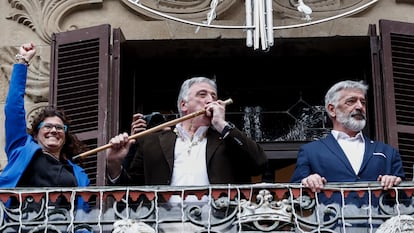 El secretario del Ayuntamiento de Pamplona leyó el resultado de la moción de censura —15 votos a favor y 11 en contra— y por la ventana del salón de plenos se escucharon perfectamente los gritos eufóricos de los cientos de gargantas que se agolpaban en el exterior: “¡UPN kampora!” (UPN fuera). El PSOE consumó este jueves un acuerdo político del que había renegado hasta ahora y facilitó a EH Bildu hacerse con uno de sus más preciados botines políticos, la alcaldía de la capital navarra, en lo que ambas partes anunciaron como el inicio de un “nuevo tiempo”. Los abertzales celebraron la investidura como regidor de Joseba Asiron recreando un pequeño sanfermín de invierno, mientras la derecha acusaba de “traición” a los socialistas.