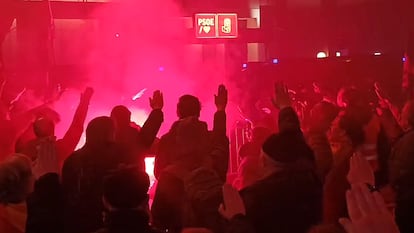 El año había empezado con relativa calma en la sede federal del PSOE tras un otoño marcado por las protestas contra la ley de amnistía, pero este viernes la calle Ferraz ha vuelto a ser el epicentro de una protesta de carácter ultra. Esta vez, no se trataba del “Noviembre nacional” —las protestas diarias en las cercanías de la sede socialista que comenzaron a principios del pasado noviembre— sino de un acto político organizado por Falange Española bajo el lema La juventud nacional contra el régimen del 78. Unas doscientas personas, según la Delegación del Gobierno, se han congregado a partir de las 20.00 frente a la sede nacional del PSOE, donde han entonado el Cara al Sol y han rendido un homenaje a Matías Montero, estudiante falangista asesinado a tiros en 1934.