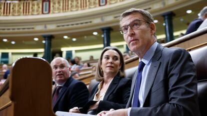 Cuca Gamarra, interviene en la sesión de control junto a Feijóo, a la derecha, y Miguel Tellado. / Mariscal / EFE