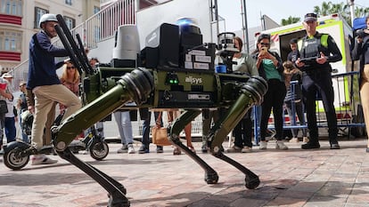 No ladra, pero es capaz de hablar, grabar con una cámara de 360 grados y hasta poner multas. La Policía Local de Málaga participa en un proyecto para probar un perro robot, que acompañará a sus agentes en distintas situaciones durante los próximos meses. Pesa 35 kilos, cuenta con distintos computadores a bordo, está repleto de sensores y, ayudado por la inteligencia artificial, es capaz de realizar trayectos de forma autónoma, alertar de emergencias o detectar infracciones. “Es un elemento de apoyo para los agentes”, según explica Pedro Merino, director del Instituto de Tecnología e Ingeniería del Software (ITIS) de la Universidad de Málaga (UMA), impulsor del prototipo.