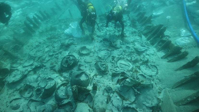 Unos arqueólogos recuperan 300 ánforas con más de cien inscripciones pintadas, monedas y zapatos en un pecio datado en el siglo IV que fue hallado casualmente por un vecino mientras nadaba en la Playa de Palma