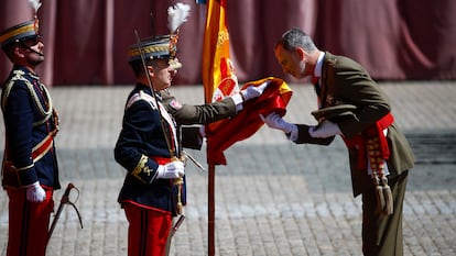 Este sábado en Zaragoza confluyen monarquía, Estado y Ejército. Felipe VI ha vuelto a jurar la bandera por sus 40 años en el Ejército de Tierra. El Rey, junto a más de 200 hombres y mujeres de su promoción ―la 44ª―, ha acudido a la Academia General Militar (AGM) de Zaragoza para renovar su compromiso con España. Ya lo hizo en 2010, cuando era príncipe, al cumplirse el 25º aniversario de servicio en el Ejército de Tierra, pero la de este sábado es una jura especial. Entre el público, formado entre otros por los alumnos de la Academia de San Gregorio (a las afueras de la capital aragonesa) estaba la dama cadete Leonor de Borbón Ortiz.