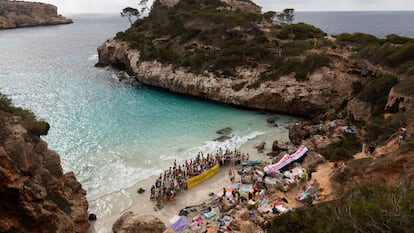 Hace veinte años a muchos les costaba llegar a Es Caló des Moro, una pequeña cala de aguas cristalinas entre acantilados de acceso abrupto en el municipio mallorquín de Santanyí. Su ubicación no estaba señalizada en los letreros de la carretera y muchos llegaban gracias a las indicaciones de amigos que habían estado alguna vez. El verano pasado, la cola para acceder a la cala llegó a alcanzar las tres horas y pocos en la isla conocen a algún residente que se haya aventurado a ir por placer en los últimos años. Dejar la toalla y la cesta era misión imposible, la orilla estaba minada de personas haciéndose fotos, el camino de acceso había quedado totalmente erosionado y los conductores que trataban de evitar los veinte minutos de paseo desde el aparcamiento más cercano embotellaban con sus coches el pequeño núcleo de viviendas impidiendo a los vecinos salir de sus casas. Este domingo, alrededor de 300 residentes han tomado la playa con el objetivo de visibilizar las consecuencias que la masificación turística tiene para los vecinos de Mallorca.