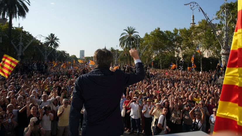 Este párrafo descriptivo origina algunas preguntas ilusionantes: ¿se han reunido esa gente y todos los medios de España avisados antes por el fugado en el centro de una gran ciudad europea, en medio del verano, sin ningún agente supervisando el orden? ¿Los había y no reconocieron al orador? ¿Si lo reconocieron, por qué no lo detuvieron? ¿Fue durante unas horas —muchas, no parece que Puigdemont madrugase tanto para llegar hoy a Barcelona, recordemos que es periodista—, el hombre indetenible, un repelente para los Mossos y, por tanto, cualquier delito que se cometiese a su vera tendría que pasar inadvertido? Si un carterista se metiese en el mitin y los Mossos fuesen advertidos y dirigidos al lugar, en caso de no estar, ¿tendrían que detenerlo de espaldas al escenario?