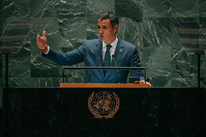 Pedro Sánchez ha aprovechado el altavoz de su discurso ante la asamblea general de la ONU en Nueva York para lanzar un mensaje duro sobre uno de los asuntos centrales de sus mensajes en los últimos meses: la lucha contra la desinformación, los bulos y el auge de la ultraderecha en buena parte del mundo occidental. El presidente español ha hablado en términos muy explícitos y dramáticos, que no había usado hasta ahora en la ONU, sobre los riesgos que corre la democracia, un asunto sobre el que también debatió estos días en Nueva York con el presidente de Brasil, Lula da Silva, también especialmente preocupado por la ola ultra que invade buena parte del planeta. “El mundo se enfrenta a un riesgo real de retroceso de la democracia”, ha arrancado el presidente. “Derechos que se creían consolidados son hoy cuestionados o revertidos. Una agenda reaccionaria global se abre paso al calor de la desconfianza en las instituciones, la polarización y la reivindicación de un pasado inventado, tan falso como sus proclamas”, ha insistido.