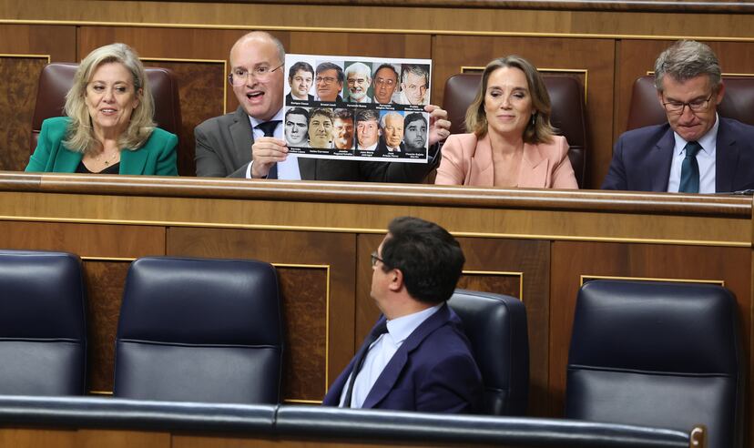 ETA ha acaparado este miércoles el debate parlamentario en el Congreso de los diputados. Tanto en la comparecencia —pedida por el PP— del presidente del Gobierno, Pedro Sánchez, para hablar de inmigración y equilibrio fiscal, como en la sesión de control posterior. El portavoz del PP, Miguel Tellado, llevaba preparado un cartel con fotografías de cargos socialistas asesinados por la banda terrorista y, dirigiéndose a la vicepresidenta primera y ministra de Hacienda, María Jesús Montero, ha preguntado: “¿De verdad que vale la pena cambiar seis votos a cambio de la dignidad de las víctimas del terrorismo en España? ¿De verdad que le compensa? Estos son los 12 cargos socialistas asesinados por ETA. ¿De verdad que va a ser capaz de mirar a los ojos a las familias de estos cargos socialistas y explicarles que seis votos para los presupuestos merecen la pena?”. María Jauregi, hija del exgobernador civil socialista en Gipuzkoa Juan María Jauregi, asesinado por ETA en 2000 y uno de los rostros que ha mostrado Tellado desde su escaño, le ha contestado a través de la red social X: “A ver si eres capaz de mirarme a los ojos y decirme que no volverás a usar la imagen de aita”. Jauregi apoya el cambio legal que afecta a las condenas de los presos etarras. Preguntada por lo ocurrido, Rosa Lluch, hija de Ernest Lluch, ministro de Sanidad en el primer gobierno socialista asesinado por la banda en el año 2000, afirma: “Tengo poco que decir. Que nos dejen tranquilos de una vez, que no utilicen más a los muertos. Estos que se autoconsideran nuestros defensores son los que juegan con nuestros sentimientos. Basta ya, por favor”.