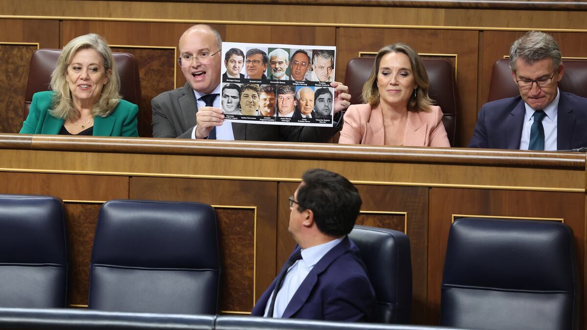 Probablemente fue esa teatralidad la que provocó que Miguel Tellado dejara una imagen difícil de olvidar en el archivo visual de las Cortes: la de dos diputados del principal partido de la oposición, él mismo y su compañera de escaño Macarena Montesinos, riéndose a la vez que agitaban en el aire las fotografías de asesinados por la banda terrorista mientras intervenía en el hemiciclo el ministro de Transformación Digital, Óscar López.