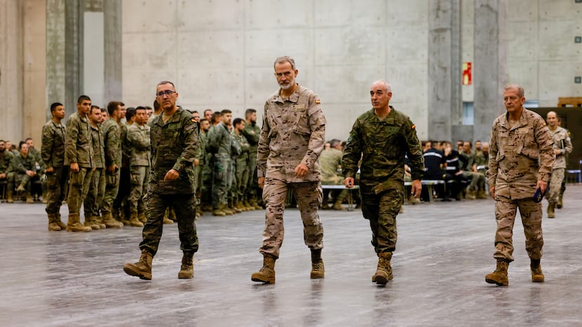 Vestido de arriba a abajo con el uniforme militar de campaña, el Rey ha viajado este martes a tres puntos clave de Valencia para los más de 8.000 militares desplegados por Defensa para hacer frente a las consecuencias devastadoras que dejó la dana el pasado 29 de octubre y que ha causado 215 muertos. Felipe VI ha visitado esta tarde junto a la ministra de Defensa, Margarita Robles, la base Jaime I de Bétera (en el norte de la ciudad de Valencia); el buque Galicia, atracado en el puerto de la capital desde el pasado 4 de noviembre; y finalmente la Feria de Muestras de Valencia, donde se ha instalado la base logística principal del Ejército de Tierra para esta emergencia. Hay que trabajar “hombro con hombro, codo con codo, humano con humano. Pero con un mismo corazón”, ha dicho Felipe VI en unas inusuales declaraciones a la prensa desde la base Jaime I de Bétera.