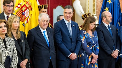 Pese a dar la legislatura por agotada, el líder del PP contempla la posibilidad de que el Gobierno saque adelante los Presupuestos generales, en función de las concesiones que Sánchez haga a los partidos independentistas. “Depende de lo que le dé a Junts”. Feijóo es consciente de que en estos momentos los socios parlamentarios de Sánchez siguen sosteniéndole, pero afirma que “no tira la toalla” con el PNV, aunque reconoce que no ha habido ningún acercamiento con el partido vasco en los últimos tiempos. A los socios de Sánchez los bautiza como “fijos discontinuos”. El ambiente en este día de la Constitución era así el de un Gobierno que está trabajando para cerrar los Presupuestos y consolidar la legislatura, pero siempre con el ojo puesto en los juzgados, de donde llegan malas noticias constantes para el Ejecutivo, mientras la oposición está concentrada en esa agenda judicial convencida de que desgastará definitivamente a Sánchez.