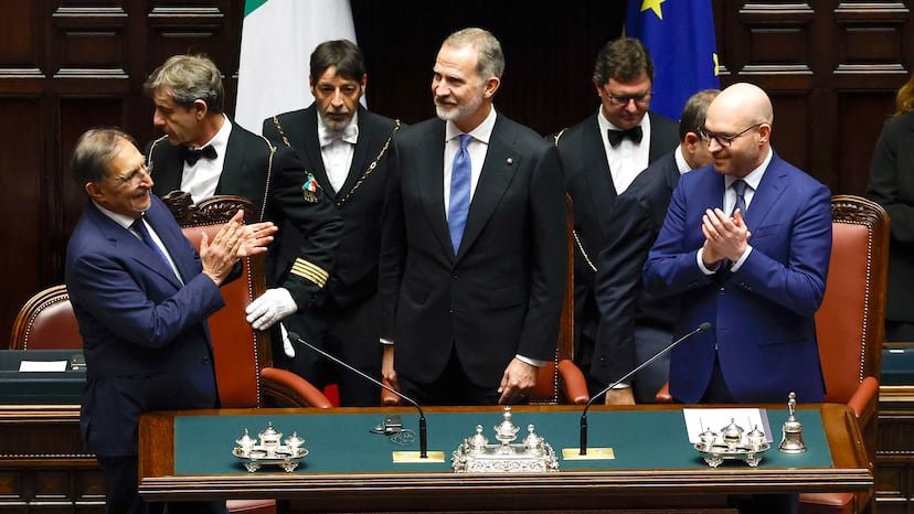 Felipe VI ha hablado esta tarde del miércoles en la Cámara de los Diputados de Italia, ante las dos cámaras reunidas, consciente de que es un raro privilegio y una jornada histórica―su padre lo hizo en 1998, pero a las dos entidades de forma separada, y el único precedente es Juan Pablo II en 2002―. Es la primera vez que unos reyes se sientan en este lugar, en un país que tras el fascismo y la Segunda Guerra Mundial votó en referéndum por la república. Y ante este parlamento, con casi todo el Gobierno de ultraderecha de Giorgia Meloni presente ―ella no estaba, tras haber comido con los Reyes―, en un discurso a ratos emotivo y con pasajes poco habituales, el Monarca dijo a los pocos minutos: “Somos dos países con memoria, con una clara conciencia del pasado, en particular del que no puede ni debe repetirse, ni siquiera como caricatura”. Lo dijo tras alabar el parlamento como lugar en el que “se afirma la democracia, las libertades individuales, los derechos humanos y el imperio de la ley”.