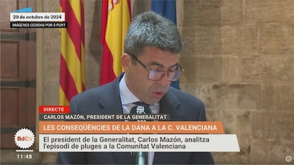 Al día siguiente, el pasado martes, cuando continuaba la alerta, Mazón explicó: “He cancelado mi agenda esta mañana. Tenía un acto en Cheste y, lógicamente, lo hemos aplazado”. El día de la dana, sin embargo, no lo hizo. De hecho, en uno de los eventos a los que asistió, se burló de las precauciones de la universidad, que había suspendido las clases para proteger a su personal y alumnado, y, a las 11.48, ante los medios, restó importancia al temporal, asegurando que a las 18.00 remitiría. A las 12.20, el jefe de climatología de la Aemet en la Comunidad Valenciana, José Ángel Núñez, con 22 años de experiencia, se pronunciaba en sentido contrario al presidente valenciano en el programa El Rall, de À punt, la radio pública autonómica: “Tenemos que estar más pendientes. En zonas donde no llueve, pueden llegar ríos, ramblas, barrancos muy crecidos y aunque los que nos estén oyendo estén en una zona que no sea de lluvia, no hay que confiarse porque estas situaciones de gota fría con precipitaciones torrenciales en sierras y en montañas de interior son las más peligrosas porque el agua corre, arrastra coches, vemos ríos y barrancos crecidos...”. Mazón subió a su cuenta oficial de X el vídeo en el que afirmaba que las lluvias remitían. Luego lo borró.