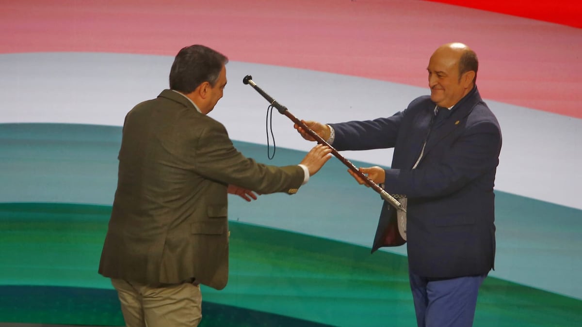 Aitor Esteban (Bilbao, 62 años) ha alzado este domingo la makila (bastón de mando) en el frontón Atano III de San Sebastián, un recinto con un gran simbolismo deportivo y político para los nacionalistas. En este escenario donde Xabier Arzalluz dirigió en 1976 el primer mitin del partido en democracia, Esteban ha apelado este domingo a la unidad del PNV, un mensaje que ha repetido en varias ocasiones durante su discurso. Esta formación ha cerrado el capítulo de la división interna que se ha dado en los últimos meses en algunas fases del proceso de renovación orgánica. El actual referente del partido ha querido salir al paso de quienes han estado “alimentando el mantra de las dos almas en el PNV” con una exclamación rotunda: “¡No hay dos almas en el PNV, hay 22.000!″, en referencia a los afiliados peneuvistas. “¡Hay 22.000 almas y laten al unísono!“, ha remarcado.