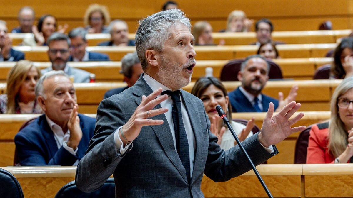 Fernando Grande-Marlaska saca un buen puñado de papeles. El ministro del Interior los mira una y otra vez, una y otra vez. De pronto, observa a su izquierda a la bancada del PP. Los ojos están puestos en la senadora popular por Ávila Alicia Rodríguez. Marlaska está a pocos segundos de escuchar al unísono y con golpes en la mesa un cántico en mitad de una sesión de control en el Senado: