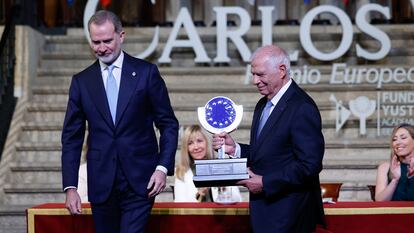 Borrell, al que se le ha visto mantener una buena sintonía con la jefatura del Estado ―el actual jefe de la Casa del Rey, Camilo Villarino, dirigió su gabinete en Bruselas cuando llevaba la política exterior de la UE, y hasta le ha colocado la corbata antes de entrar en la sala donde iba a recoger el premio―, ha sido una “figura clave” en el desarrollo de una “verdadera política exterior europea y en la proyección de la UE como actor global”, ha recordado Felipe VI. El exjefe de la diplomacia comunitaria, nacido en La Pobla de Segur (Lleida) hace 78 años, también ha presidido la Eurocámara entre 2004 y 2007 y ha sido ministro de Exteriores con Pedro Sánchez como presidente, entre otros cargos.