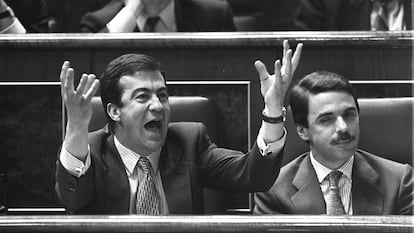 Aquel Congreso de 1994 también pintaba muy distinto al actual. En aquella bancada del Gobierno terminal de González había 13 ministros hombres y solo tres mujeres. En el equipo directo que arropó a Aznar, a su lado, se sentaban el secretario general del PP, Francisco Álvarez Cascos, del que ahora Miguel Tellado puja para convertirse en su émulo en gestos y contundencia, y Rodrigo Rato, ambos más protagonistas recientes en los juzgados que por su legado político.