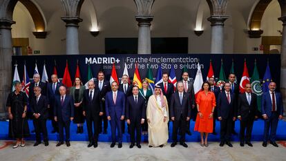 El jefe de la diplomacia española, José Manuel Albares, ha ejercido este domingo como anfitrión de la tercera reunión del denominado grupo Madrid+, en la que han participado más del doble de países que en las dos citas anteriores, la última en septiembre pasado. En el palacio de Santa Cruz, sede histórica del departamento de Exteriores, se han reunido delegaciones de 20 países: dos primeros ministros (Palestina y Qatar), dos viceprimeros ministros (Jordania y Eslovenia), ocho ministros (España, Arabia Saudí, Brasil, Noruega, Portugal, Egipto, Malta e Islandia) y siete viceministros, así como representantes de la UE, la Liga Árabe y la Conferencia Islámica. El titular francés de Exteriores, Jean-Noël Barrot, ha intervenido por videoconferencia.