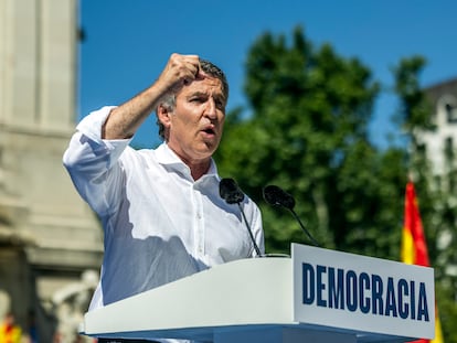 Pero la orden es evitar en público la confrontación y hacer oídos sordos al desafío a la estrategia de Feijóo que supone que Ayuso se levantara el viernes de la Conferencia de Presidentes, y que haya recibido al presidente de Argentina, Javier Milei, de visita en España para participar en un acto ultra cercano a Vox. El portavoz nacional ha sorteado la pregunta sobre esa discrepancia de estrategias, pero sí ha reivindicado la apuesta por la “centralidad” y la “moderación” que defendió Feijóo en su discurso este domingo. Hace solo unos días, también el líder popular llamó a Sánchez el “capo de la mafia”, unas palabras que no repitió en la protesta del domingo.