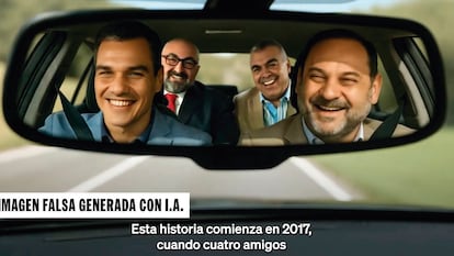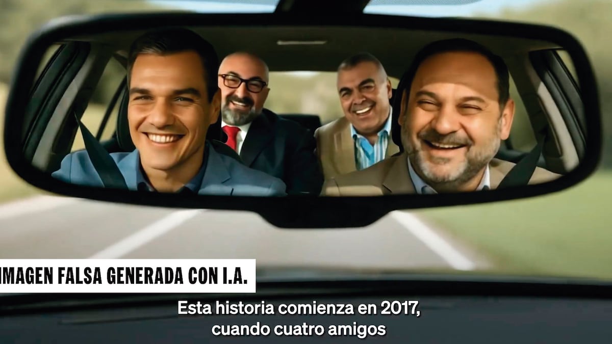 Con el mensaje “Queda UNO [por Sánchez] para que caiga toda la banda”, el PP ha lanzado un vídeo generado por inteligencia artificial que arranca con una locución en off que reza: “Esta historia comienza en 2017, cuando cuatro amigos se recorrieron España en un peugeot para ganar las primarias del PSOE. Y lo consiguieron. E incluso llegaron al Gobierno”. Mientras, muestra a Pedro Sánchez, José Luis Ábalos, Koldo García y Santos Cerdán a través del espejo retrovisor de un coche.