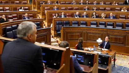 Bolaños ha expuesto sus reformas sin que surgieran nuevas protestas, incluso cuando se ha quejado de que minutos antes el hemiciclo “parecía un campo de fútbol”. Pero al final de ese debate, cuando el ministro ha subido de nuevo a la tribuna para replicar a la andanada de descalificaciones de la popular Cayetana Álvarez de Toledo y de la portavoz de Vox, Pepa Millán, se ha disparado de nuevo la tensión. Han arreciado otra vez las protestas y pateos desde la bancada popular exigiendo la dimisión de Cerdán. “¡Corrupto!“, ha gritado alguien al ministro. Cuando este ha dicho que hablaba ”desde la humildad", los escaños del PP han vuelto a alterarse: “¡Sí, hombre!“.