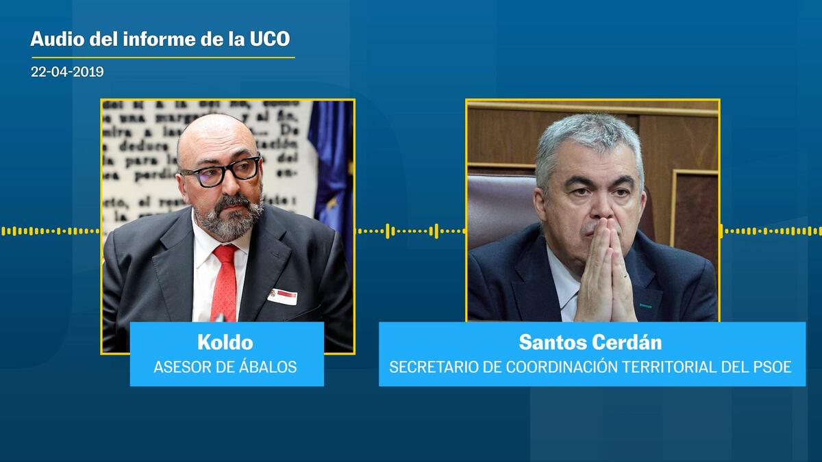El informe de la Unidad Operativa de la Guardia Civil (UCO) que ha puesto patas arriba al PSOE y ha hecho tambalear al Gobierno de Pedro Sánchez incluye decenas de horas de audios grabados por Koldo García, el principal asesor del exsecretario de Organización del PSOE y exministro de Transportes, José Luis Ábalos. En una grabación del 22 de abril de 2019, Koldo García registra una conversación con Santos Cerdán en la que el primero dice haber recibido y entregado 60.000 euros de los que, según Santos, 50.000 eran para Ábalos y 10.000 para García.