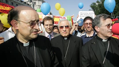 No fue el único pico de tensión. Junio de 2005 dejó una imagen impactante. Con sus sotanas y alzacuellos, más de una decena de obispos, liderados por Antonio María Rouco Varela, se manifestaron contra la ley del matrimonio igualitario. Fueron años en que numerosos obispos perdieron la inhibición ante la manifestación callejera. Sobre todo Rouco. En 2007, el arzobispo de Madrid reunió a una multitud en un acto por la “familia cristiana” en el que el cardenal alertó de una “marcha atrás” en “derechos humanos” por la legislación española.