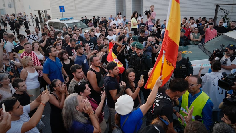 A las 19.30 de este martes, un grupo de hombres fornidos se ocultaban en un garaje. Las calles aledañas de la plaza del Ayuntamiento de Torre Pacheco estaban vacías y todo hacía prever un pinchazo en la gran convocatoria de algunos grupos de ultraderecha que llamaban a la “caza al magrebí”. Media hora antes de constatar que el pueblo de 40.000 habitantes, cercado desde hace cinco noches consecutivas por el odio racista y xenófobo, está ya cansado de que un nuevo conflicto eleve más la tensión, esos cuatro hombres salían de la cochera en un Audi Q5 escoltados por la Guardia Civil hacia la salida del pueblo. Eran Daniel Esteve y los suyos, de la empresa Desokupa, uno de los principales convocantes. A las 20.00, unas 150 personas, según fuentes policiales, se arremolinaba en una esquina cercana ante decenas de medios de comunicación. La gran movilización contra la inmigración se ha desinflado en un municipio que vive también de lo que cientos de vecinos de origen marroquí cosechan del campo.