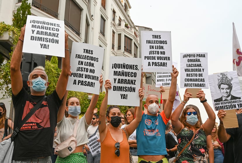 Varios cientos de personas se han reunido en la tarde de este lunes en León para cargar contra la gestión forestal de la Junta de Castilla y León, donde han muerto tres personas y ardido decenas de miles de hectáreas. Los asistentes han reclamado la dimisión del presidente autonómico, Alfonso Fernández Mañueco, del PP, y de su consejero de Medio Ambiente, Juan Carlos Suárez-Quiñones. Varios convocantes de la manifestación en la capital leonesa, entre ellos bomberos forestales, han demandado más prevención e inversiones más elevadas para el dispositivo contra incendios al tiempo que han instado a su Ejecutivo a elevar al nivel 3 el grado de Emergencia, estatus máximo donde entraría como autoridad competente el Estado central. “El humo no tapa vuestra incompetencia”, rezaba alguna pancarta, además de “¡Arde León!” o “Un euro en prevención, 100 ahorrados en extinción”.