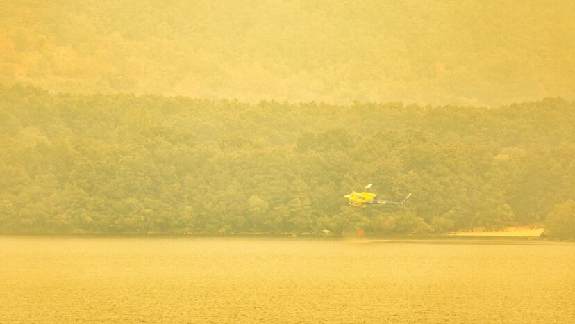 El agua del Lago de Sanabria está turbia, amarillenta. En la orilla, donde se acumula la ceniza, es incluso negra. Y está templada. La imagen contrasta con la de hace una semana, o más bien con la de siempre en este paisaje zamorano. La del agua transparente, propia de un lago de origen glacial con una superficie de 350 hectáreas de extensión, el más grande de España. La zona, dentro de un Parque Natural, está acordonada bajo unas estrictas medidas de seguridad y el sonido de las sirenas es constante. También el ruido de los motores de los hidroaviones. Un helicóptero sobrevuela el embalse, envuelto en humo. Desciende, se carga de agua y se dirige a uno de los tres focos del incendio de Porto (Zamora) que aún este viernes están activos.
