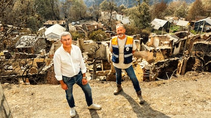La fotografía que encabeza este reportaje se tomó en uno de los pueblos más devastados tras el paso de las llamas. En San Vicente de Leira (Ourense), el fuego del incendio del Larouco —el más grave de la historia de Galicia— entró en casas y calles, dejando tras de sí unas 60 viviendas arrasadas, como si les hubiera caído una bomba encima. El jueves pasado, seis alcaldes de la comarca de Valdeorras fueron citados allí por EL PAÍS para hablar de unas jornadas agónicas y agruparse en una instantánea conjunta. Dos de ellos del PSOE, una del BNG y tres del PP. Pero la cita no se produjo como estaba prevista. El fuego la frustró. Hubo quien no se presentó porque se reactivaron las llamas en sus municipios y tenían que seguir coordinando las acciones de los vecinos, que se han enfrentado al fuego ante la “escasez de medios”. A otros les surgieron inesperadas labores en medio de la catástrofe. Otro regidor rehusó la invitación porque ya por teléfono no podía contener las lágrimas. Finalmente, el relato de estos días lo dan en persona dos alcaldes del PSOE y otro del PP de Castilla y León, por teléfono.