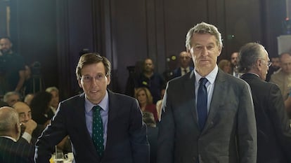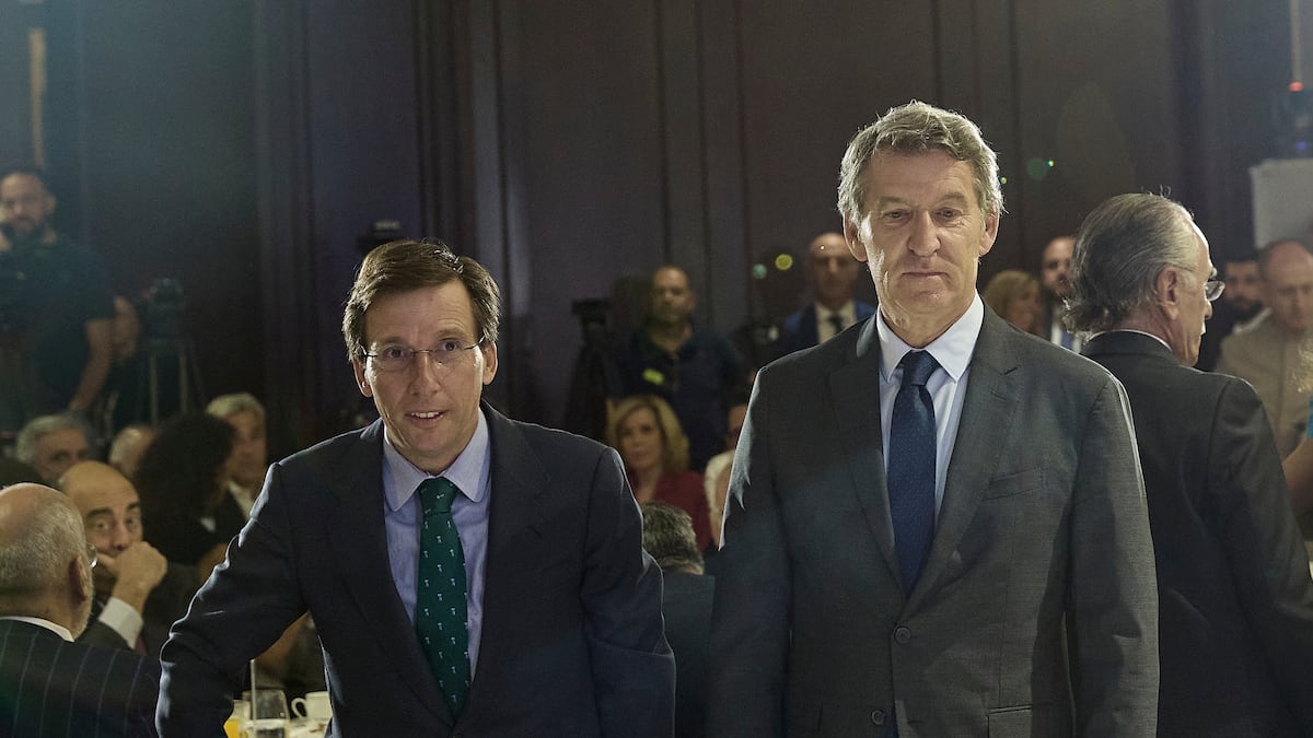 El líder del PP arropa al alcalde de Madrid en un desayuno informativo. Almeida carga contra el presidente por “cubrir sus carencias políticas” con “disturbios” en la capital