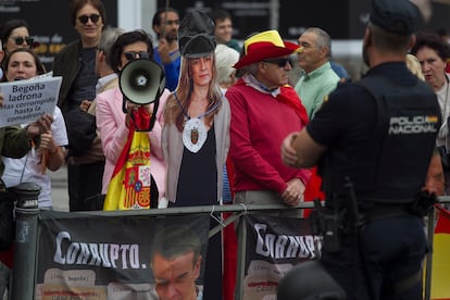 La organización ultracatólica Hazte Oír, que coordina a las acusaciones populares, reunió a unas 100 personas en las inmediaciones en una concentración bajo el lema “No al corrupto”. Por la zona también circuló un camión pequeño con una pantalla incrustada de gran tamaño en la que se veían imágenes de la esposa del presidente bajo el rótulo “pentaimputada”.