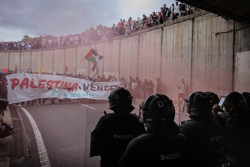 Los manifestantes han empezado la protesta pasadas las seis de la tarde increpando a los agentes antidisturbios de los Mossos d’Esquadra que han cortado la vía en la entrada del túnel. Con gritos de “boicot a Israel” y “Palestina libertad”, la manifestación ha comenzado con momentos de tensión. Los Mossos han logrado inicialmente desalojar a los manifestantes de la ronda de Litoral, con un cordón policial, pero poco después ha vuelto a llenarse de personas que gritaban consignas como “Free Palestine”, “Boicot Israel”, “fuera las fuerzas de ocupación” o “que no, que no, que no, Israel no es un país, es una ocupación”.
